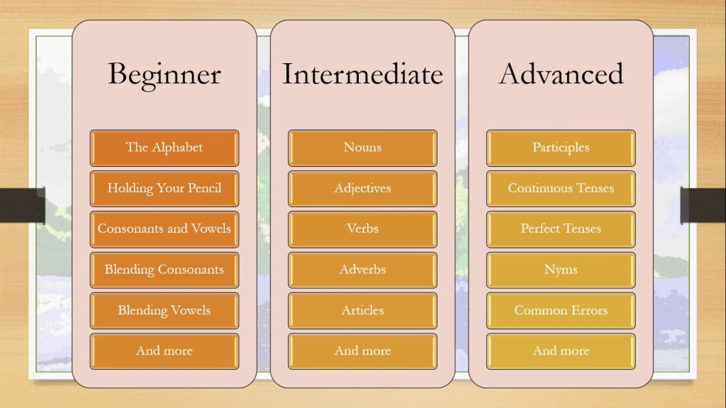 This course has three levels – beginner where the focus is letter shapes, names, sounds, pronunciation and articulation. The intermediate level introduces the parts of a sentence and sentence construction. More complex tenses are presented in the advanced level.